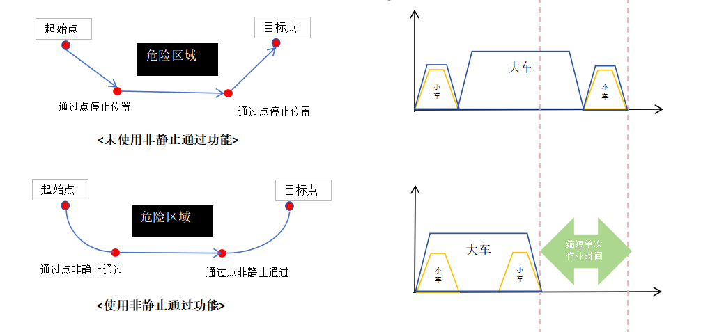 如上圖所示,在無人天車移動區(qū)間內(nèi)避開危險區(qū)域時,使用非靜止通過功能,天車收到指令,經(jīng)過避障通過點位置時,天車運行速度非0,繼續(xù)向目標(biāo)位置運行。當(dāng)未使用非靜止通過功能時,天車在起始點之后的每個通過點位置都速度降為0,再進行啟動向下一通過點運行,直到到達目標(biāo)點,這樣會產(chǎn)生頻繁且冗余的加速/減速時間,降低單次作業(yè)效率,從而降低總體作業(yè)效率。